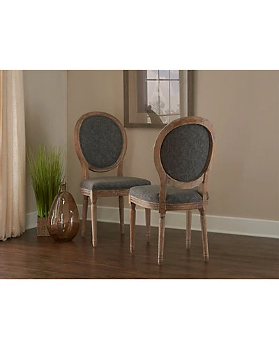 - Design details: The Avalon Oval Back Chair has a French inspired design and style. Crafted from Elm, the frame has a dark natural brown finish and is accented with detailed carvings. Charcoal colored upholstery graces the seat and chair back. Twopc set.