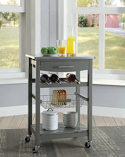 - Design details: Expand your kitchen workspace with the Clarke Kitchen Cart. A single pull out storage drawer, wire basket, wine bottle storage rack and single shelf, provide ample storage space for all of your kitchen essentials. Durable castors make for easy mobility throughout your space and lock for safety. The gray finish easily coordinates with existing decor. Ideal for small spaces.