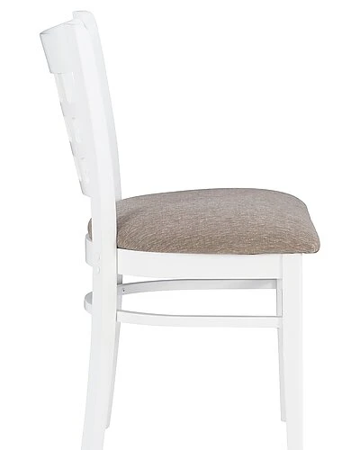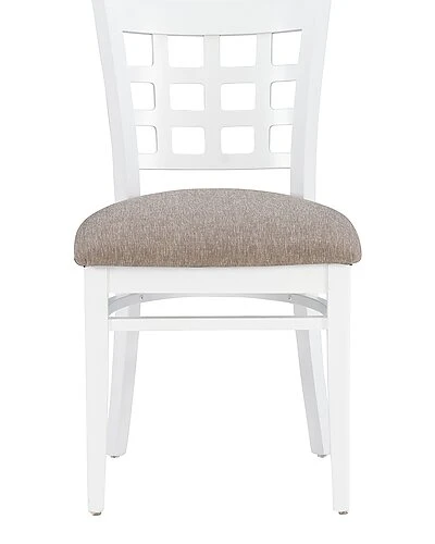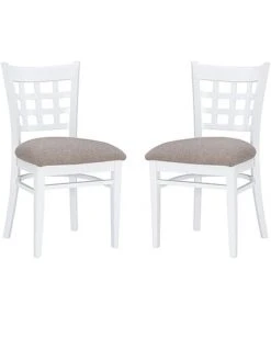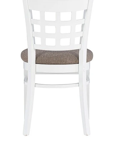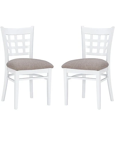 - Traditional, yet informed by modern sentiment, this farmhouse side chair is a wonderful addition to a variety of decor settings. A grid of open squares is framed by the curved back, inspired by lattice fencing of distant countrysides. The wide padded seat is upholstered with light grey polyester fabric for added comfort and easy cleaning. Made of solid beechwood for ensured strength and stability, the frame is painted white, then sealed and sanded before receiving a glossy lacquer finish. The set of two arrives fully assembled and supports up to 300 lbs each seat.
