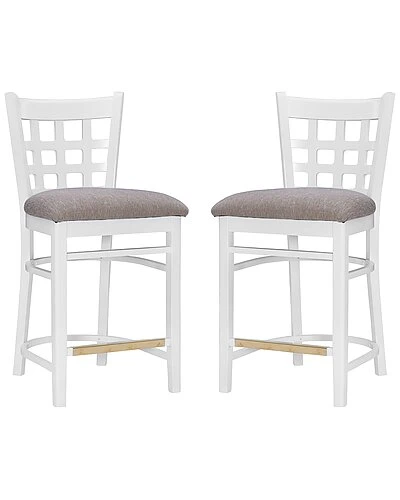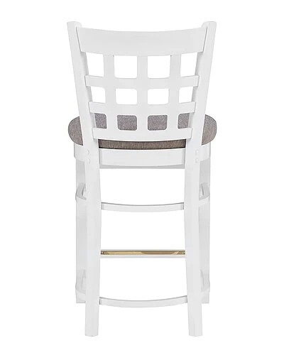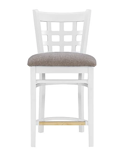 - Holding to tradition, yet striking balance with modern temperament, this farmhouse style counter stool is a perfect addition to a variety of dining settings. A grid of open squares is framed by the curved back, inspired by lattice fencing of distant countrysides. Made of solid beechwood for ensured strength and stability, the frame is painted white, then sealed and sanded before receiving a glossy lacquer finish. The wide padded seat is upholstered with light grey polyester fabric for added comfort and easy cleaning. This counter stool set of two arrives fully assembled and ready for your home.