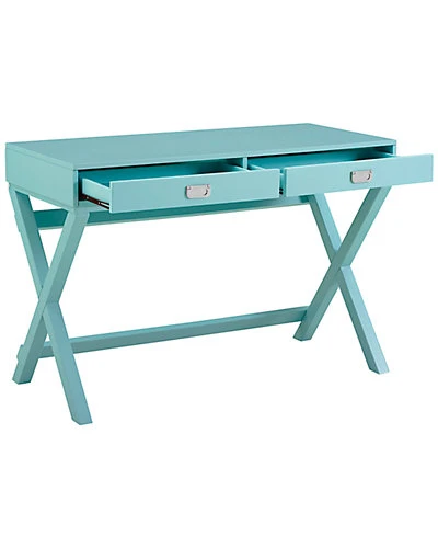 - Design details: Make work fun with this campaign style Peggy Writing Desk. Finished in Bright Blue with silver hardware, this desk will add color and life to any space. Along with its fun pop of color the X-framed legs help keep the space sturdy. Two drawers provide ample space for supplies.